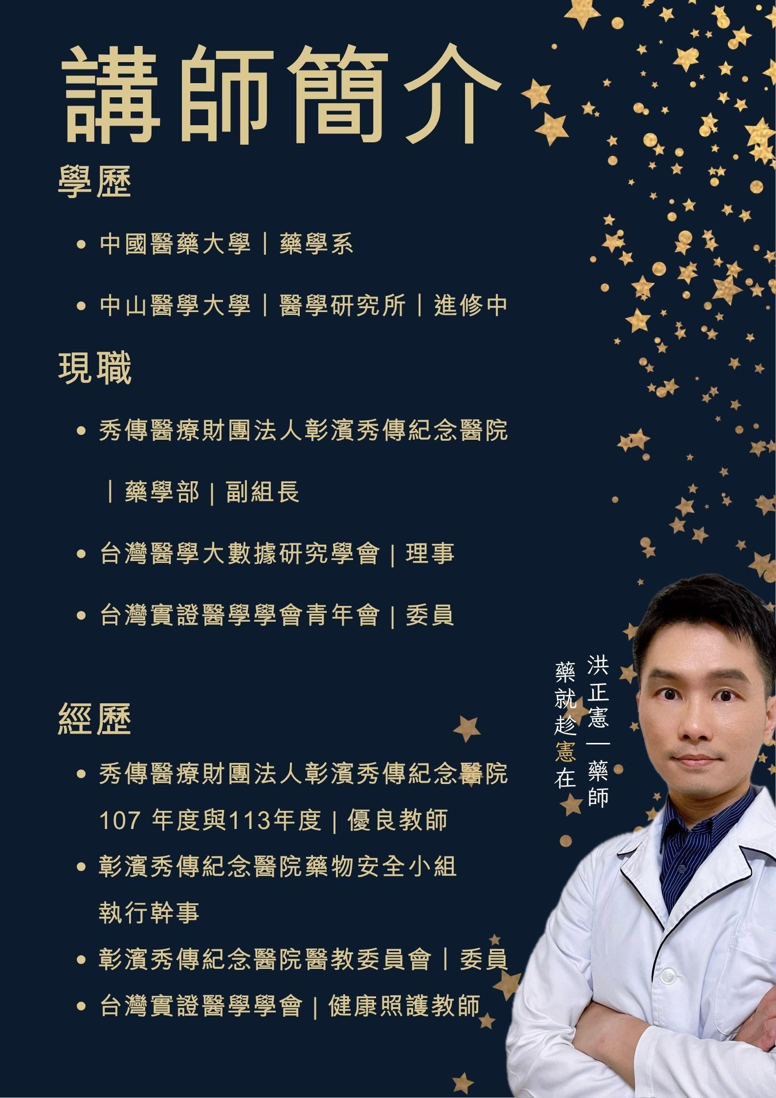 現職 秀傳醫療財團法人彰濱秀傳紀念醫院 藥學部 | 副組長 台灣醫學大數據研究學會 | 理事 台灣實證醫學學會青年會 | 委員
