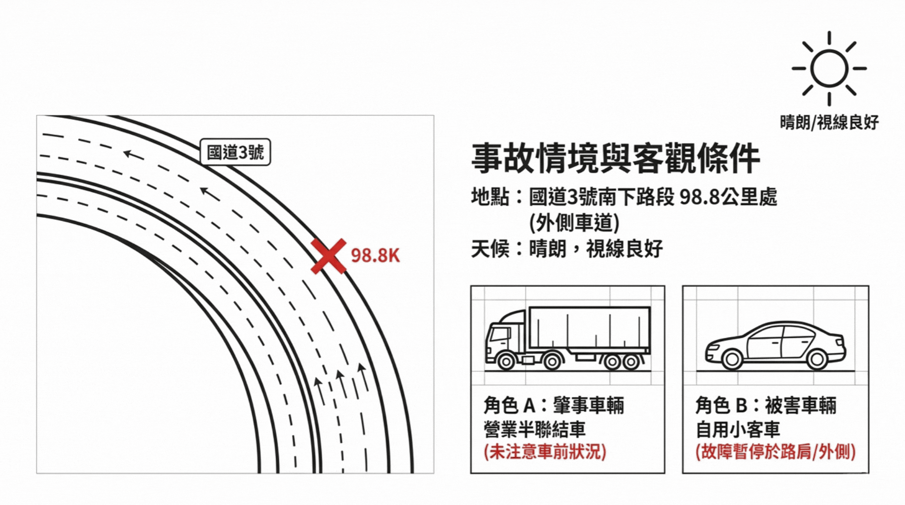 案發經過被告駕駛營業半聯結車行經國道3號南下路段時,疏未注意車前狀況,猛烈追撞前方因故障暫停於外側車道的小客車。當時被害人雖已在車後擺放紅色三角警示標誌,仍遭被告車輛撞擊,導致全身多處骨折、創傷性休克,送醫急救無效身亡。