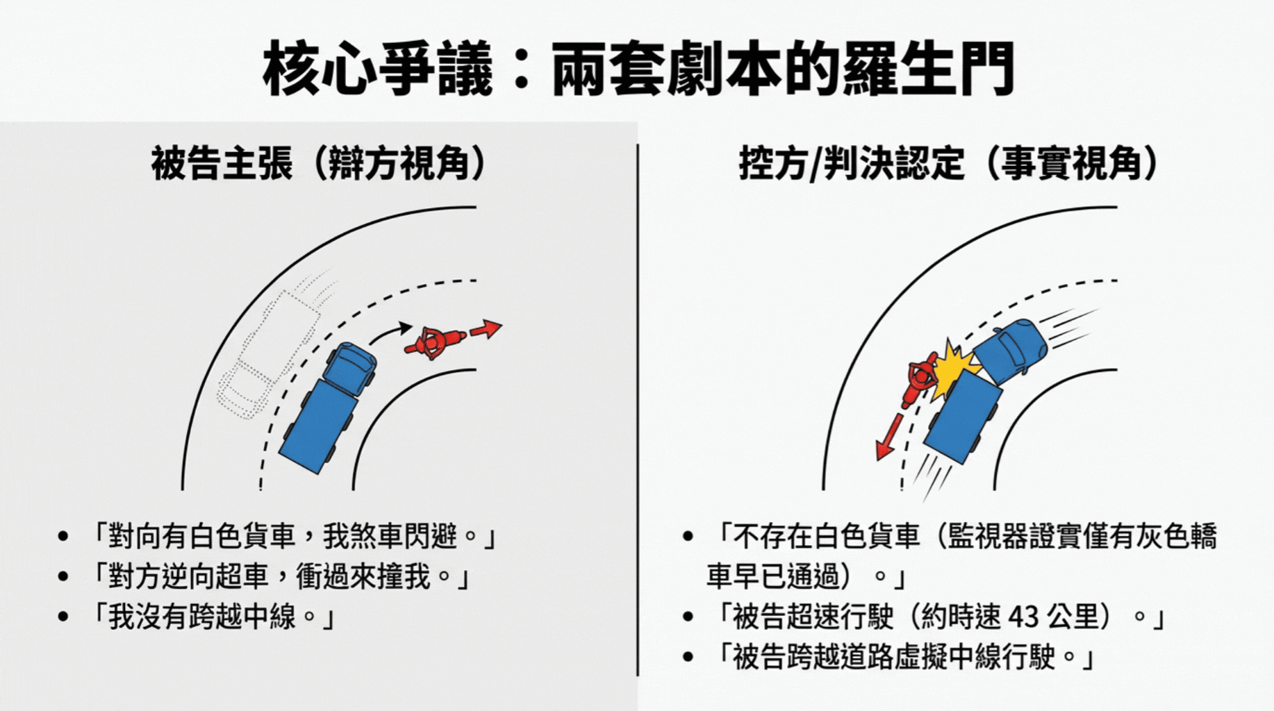 本案發生於新竹縣鄉間道路(未劃設分向線)。被告駕駛自用小貨車行經該路段時,與對向騎乘機車的被害人發生碰撞,導致被害人頭部重創,送醫後不治死亡。