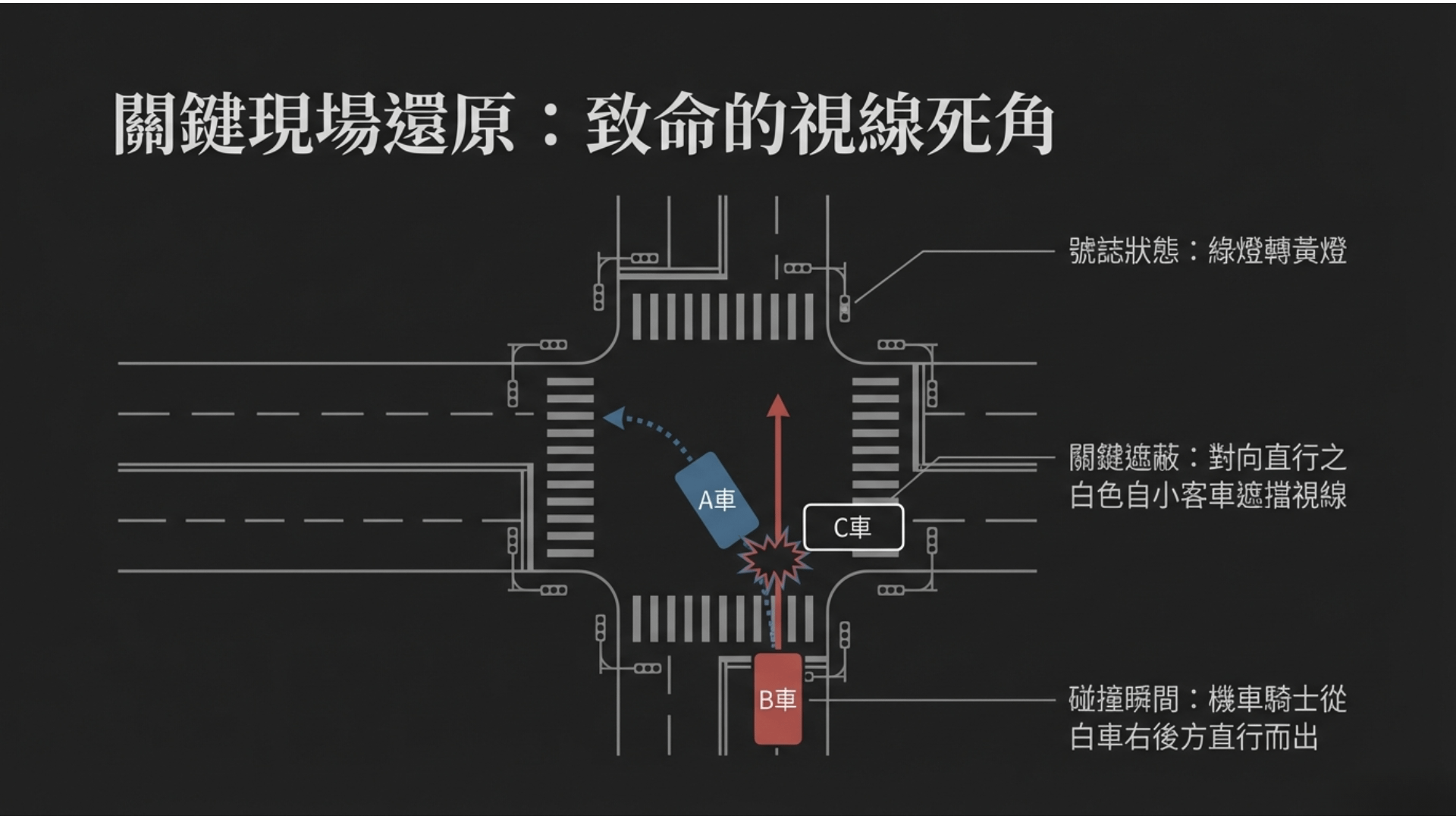 殊不知,被害人機車從「白色轎車」的右後方高速竄出(俗稱「鬼探頭」),雙方閃避不及,機車撞上被告車輛右後側。 - 後果: