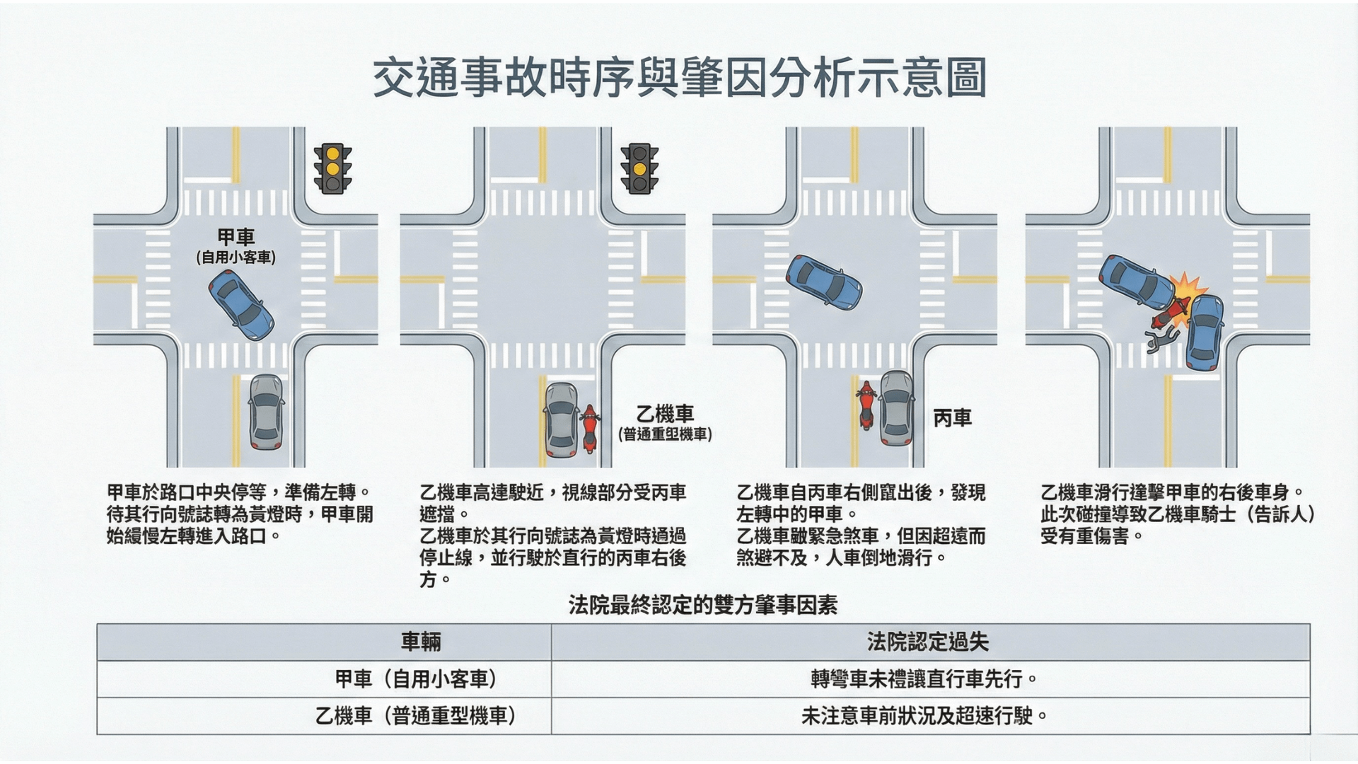 - 當事人:被告(左轉車): 駕駛自小客車,欲在路口左轉。被害人(直行車): 騎乘機車,對向直行。