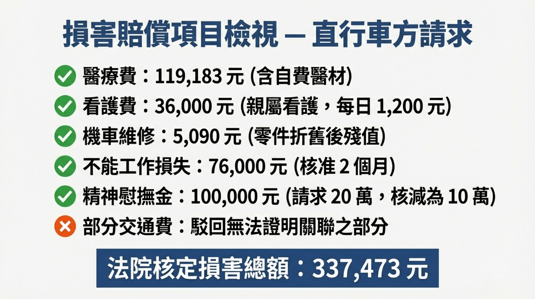 - 原告由配偶照顧 1 個月。法院指出,親屬看護雖無實際金錢支付,但基於身分關係之恩惠不能加惠於加害人,仍得評價為金錢損害。