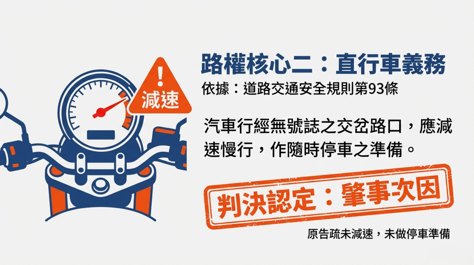 行經無號誌路口左轉彎,未注意對向直行車並讓其先行,為肇事主因。 - 原告(直行車):