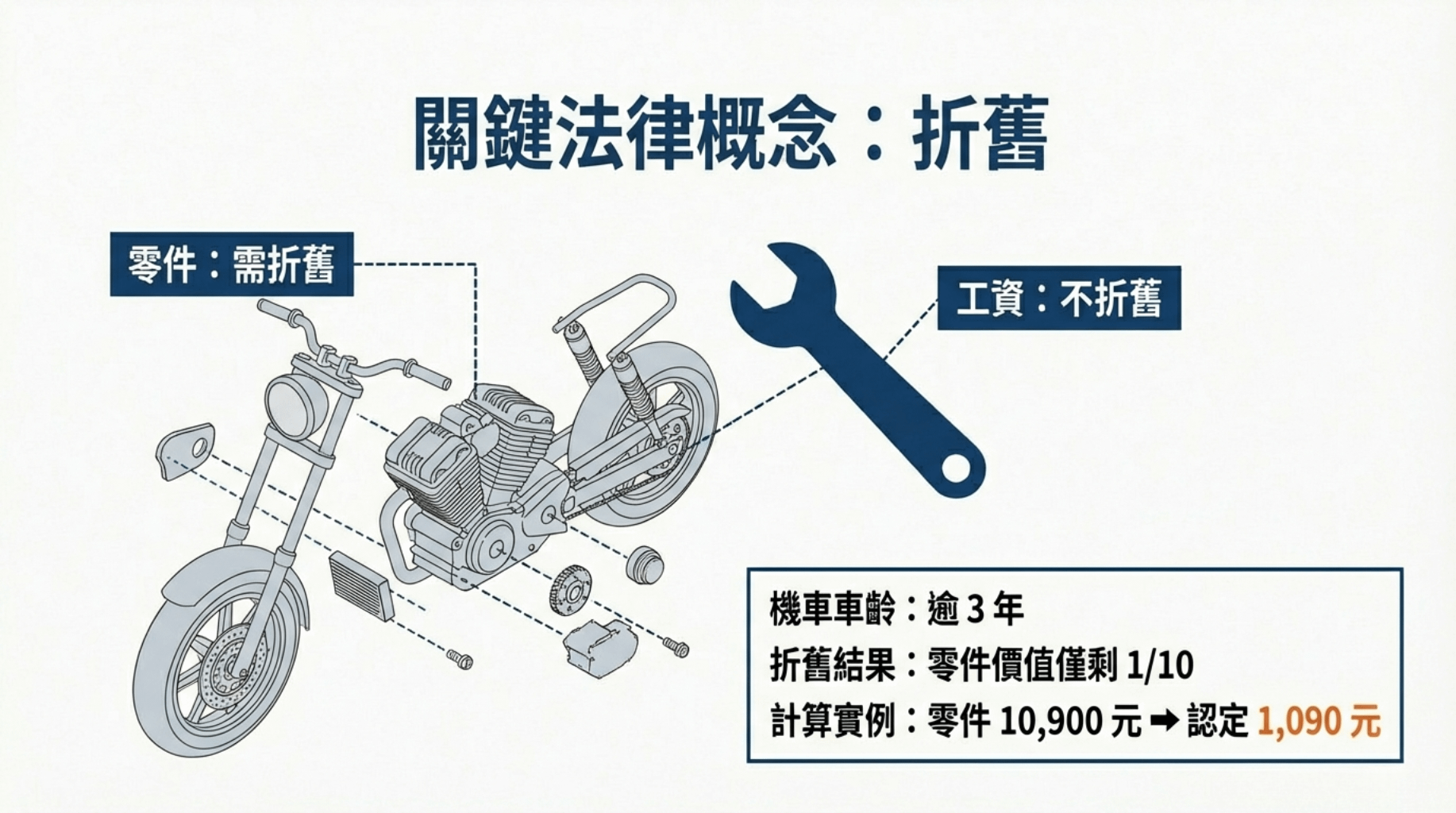 超過耐用年限(如機車通常為 3 年)的車輛,其「零件」部分的賠償會被大幅折舊至僅剩 1/10,但「工資」部分不折舊。 - 過失相抵原則: