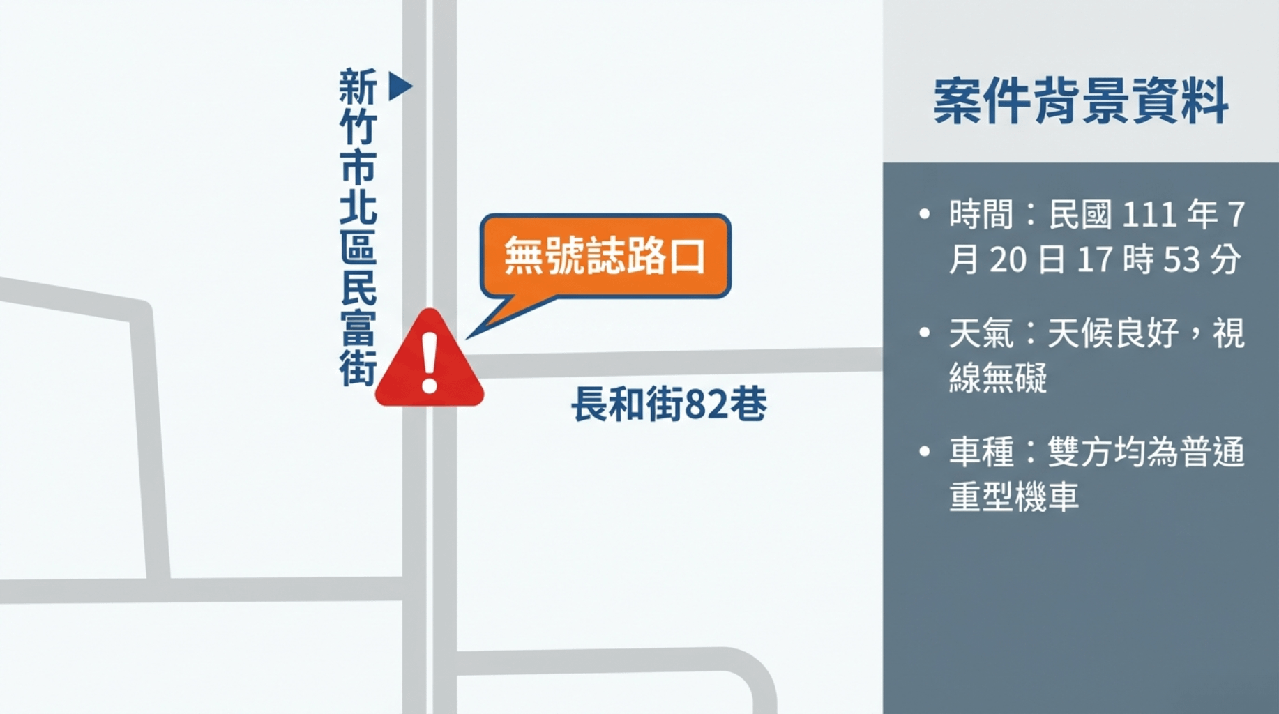 本案發生於民國 111 年 7 月間傍晚,地點位於新竹市某無號誌交岔路口。