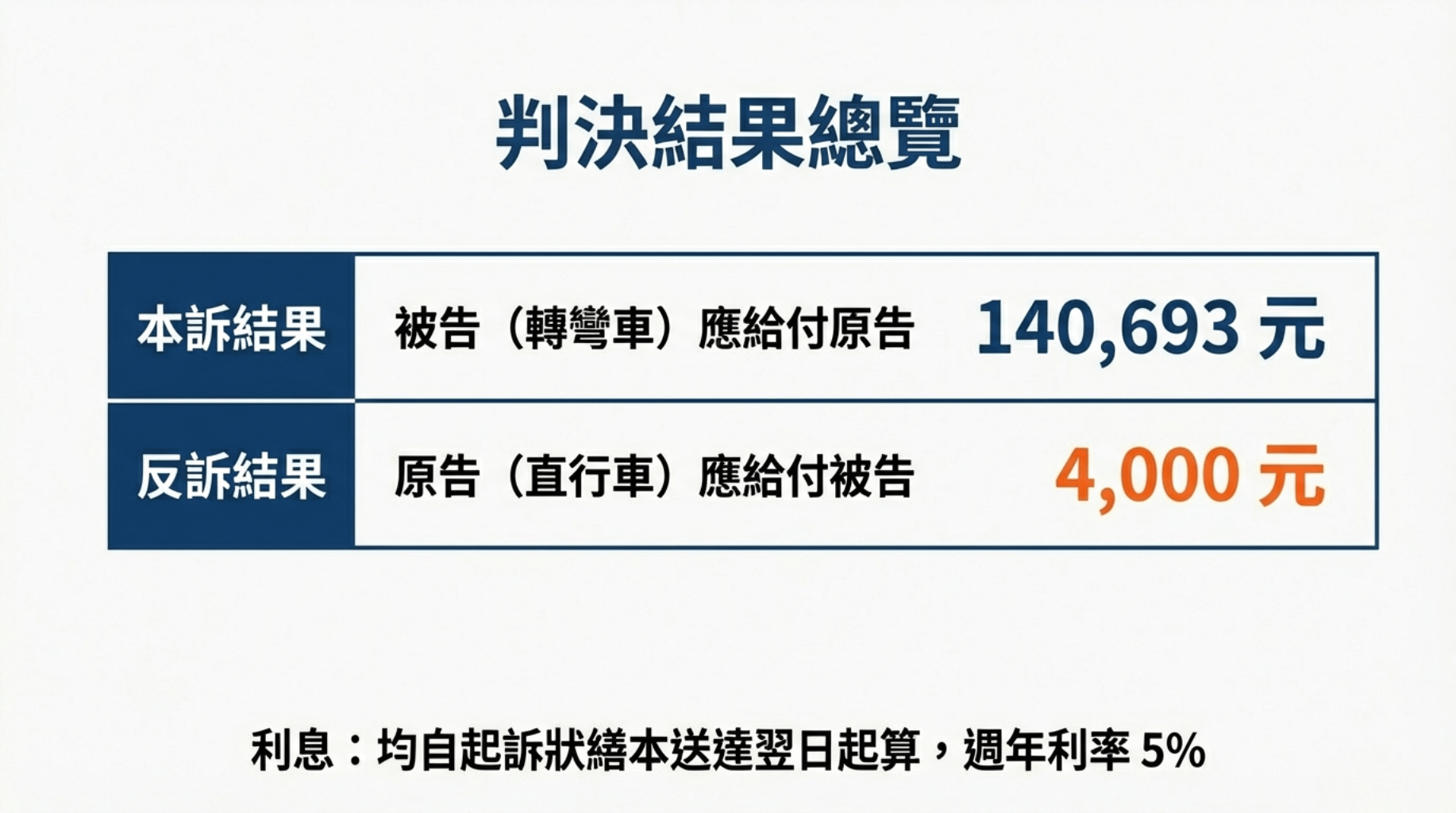 - 本訴裁判:被告應給付原告 140,693 元 及法定遲延利息。